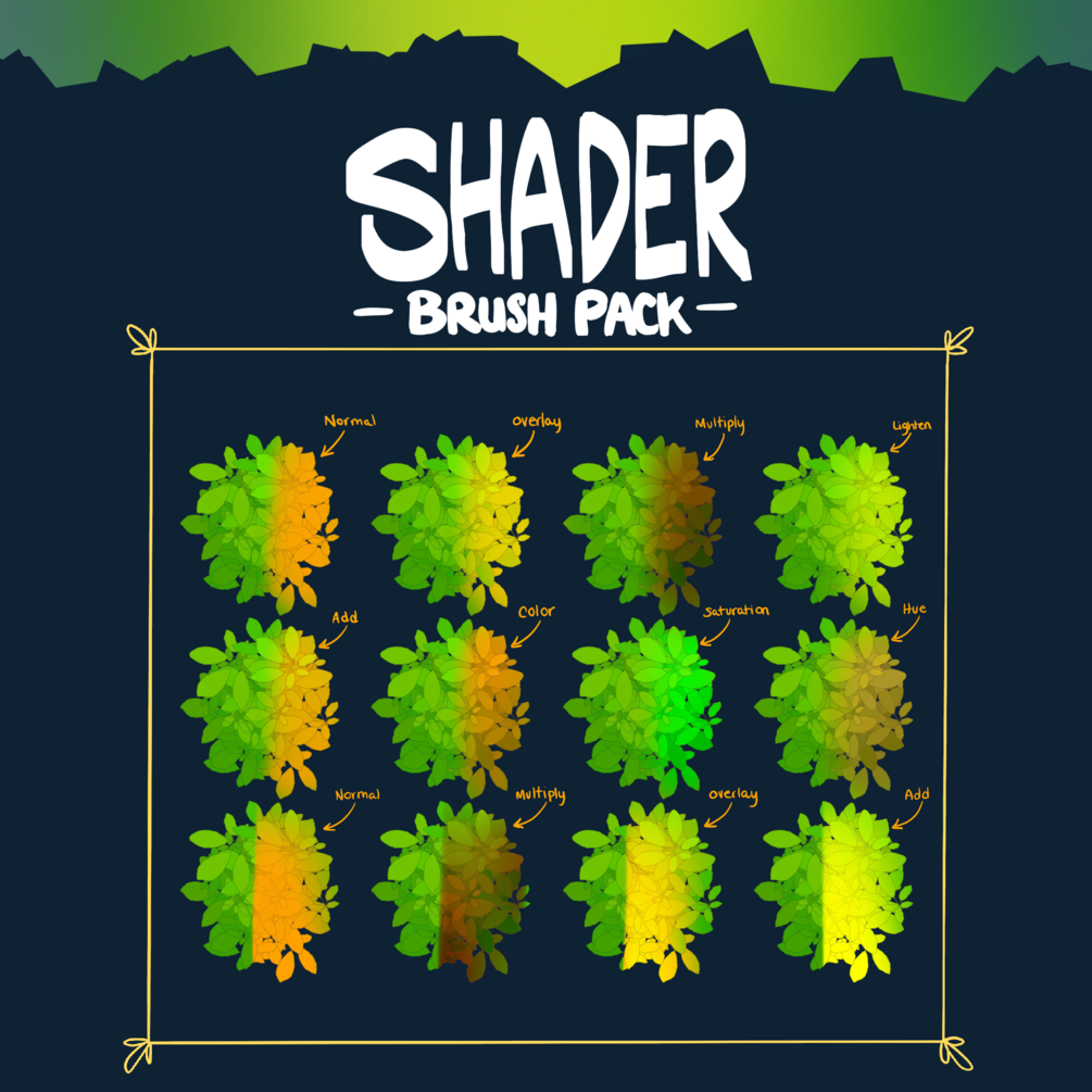 • Soft Brushes - 8 gentle brushes with blurred edges for a smooth experience. Contains a base Normal brush and duplicate brushes for Overlay, Multiply, Add, Hue, Saturation, Lighten, and Color blend modes.
